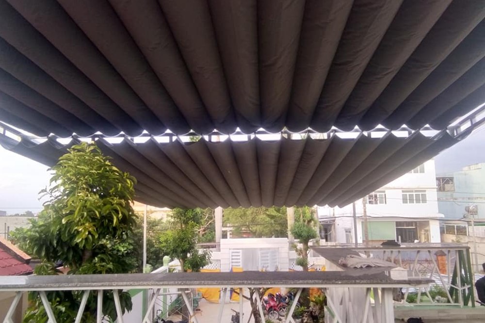 Mái bạt xếp thường được sử dụng nhiều ở các quán lẩu – nướng khói ngoài trời. Mái bạt xếp có động cơ tự động điều chỉnh căng ra hoặc gấp lại. Khi thời tiết thay đổi bất chợt, chủ quán có thể nhanh chóng mở bạt ra che cho khách. Chính vì có động cơ nên giá thành của loại bạt này khá mắc và tốn chi phí bảo hành sửa chữa trong quá trình sử dụng.