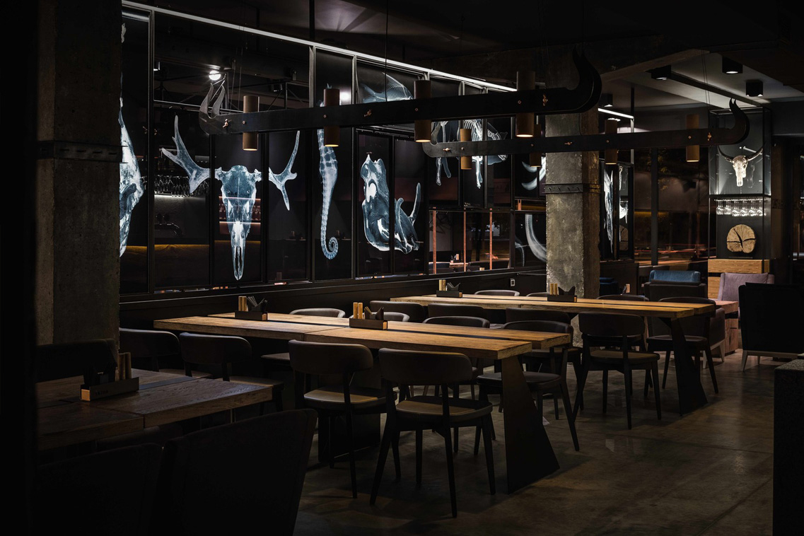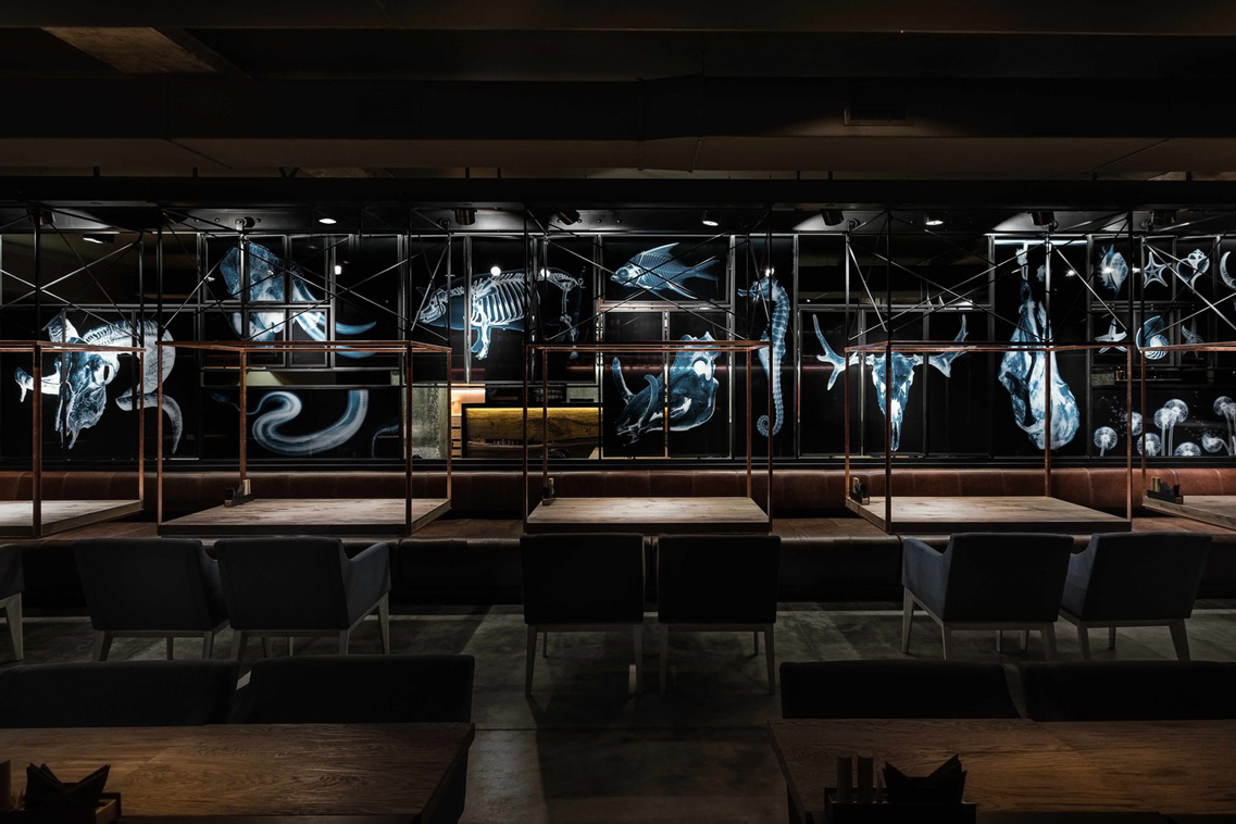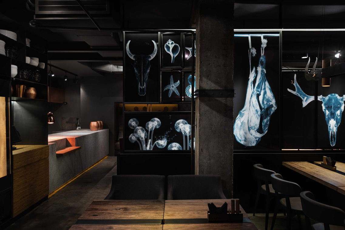 Điểm gây ấn tượng nhất của nhà hàng này chính là những bức ảnh mô tả bộ xương của động vật, thông qua lăng kính tia X, có thể thấy vẻ đẹp vốn có của chúng.