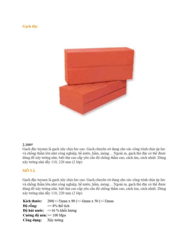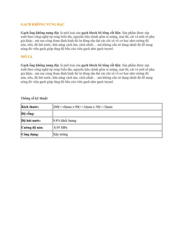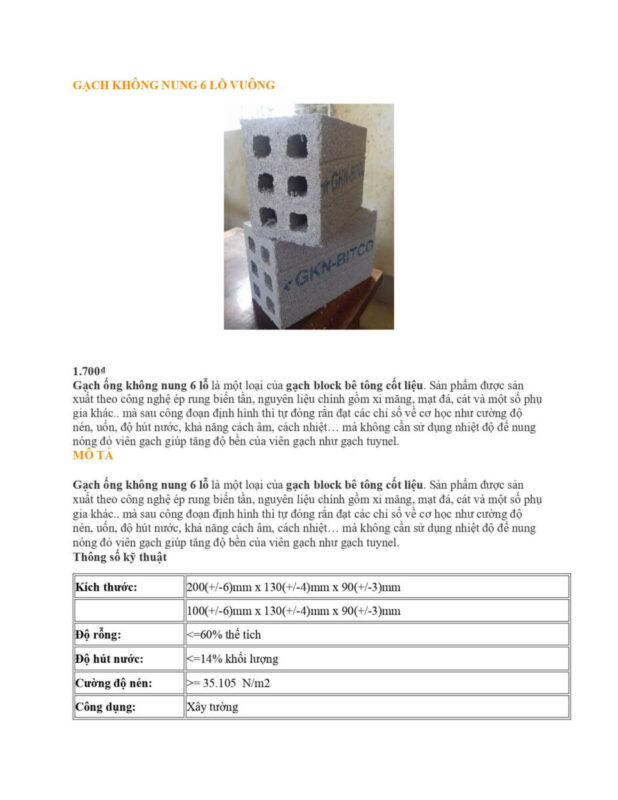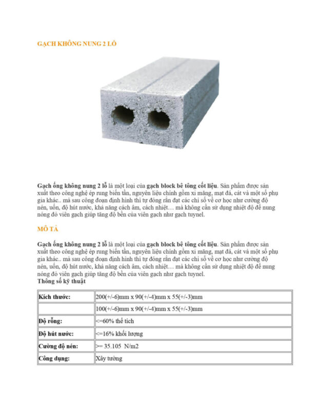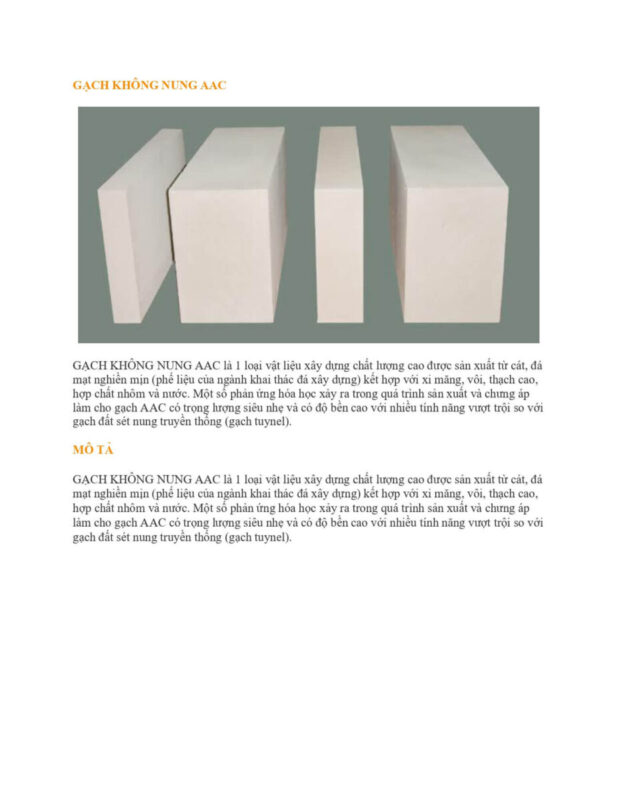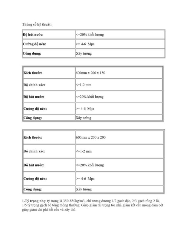 THÔNG TIN KĨ THUẬT SẢN PHẨM GẠCH AAC