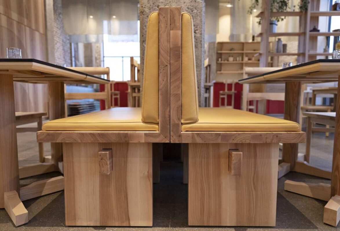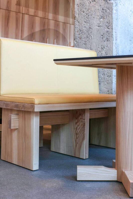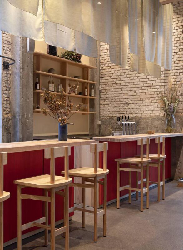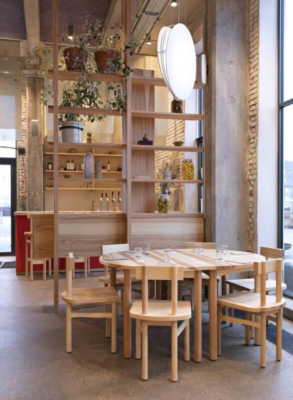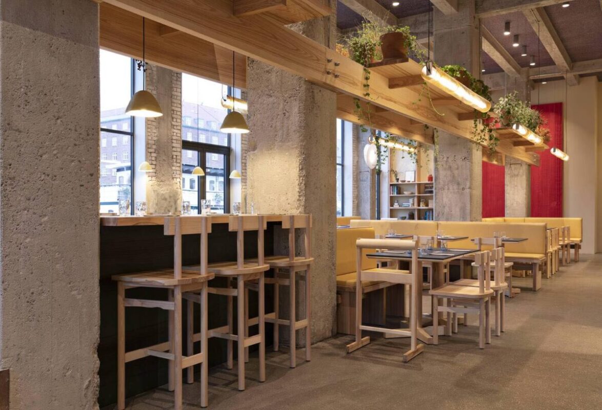 Nội thất ấm áp, đơn giản và nổi bật được thiết kế bởi Spacon & X, với các yếu tố nội thất đặt làm riêng, đèn giấy và thủy tinh được làm thủ công và các tác phẩm nghệ thuật kết hợp với bộ sưu tập đồ nội thất đặt làm riêng. Màu chính của thiết kế bao gồm gỗ tần bì nâu đã được tẩm dầu tự nhiên kết hợp với màu ấm áp của màu đỏ anh túc, hoa phụ và hoa cỏ để phản ánh cả thực đơn bốn mùa của Đan Mạch và POPL.