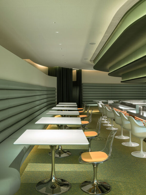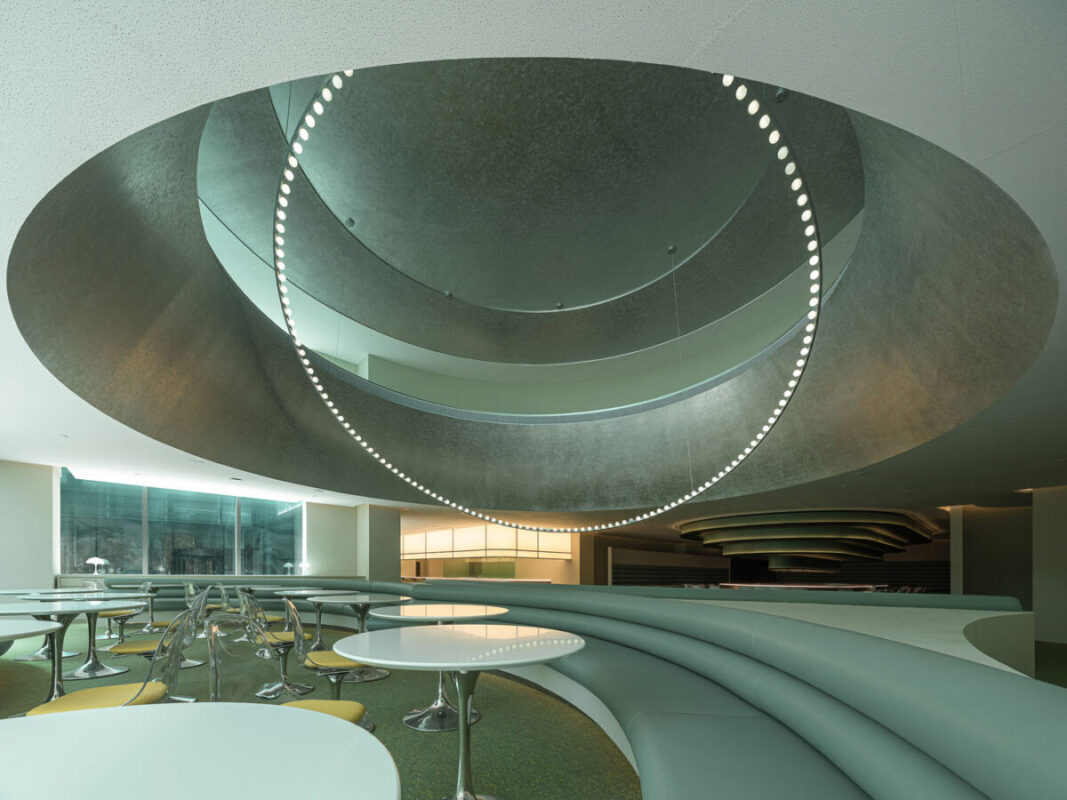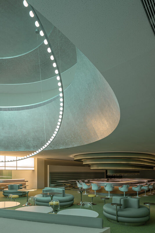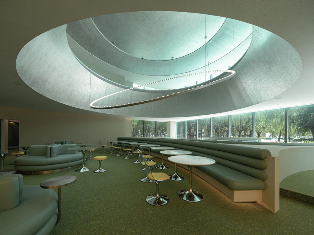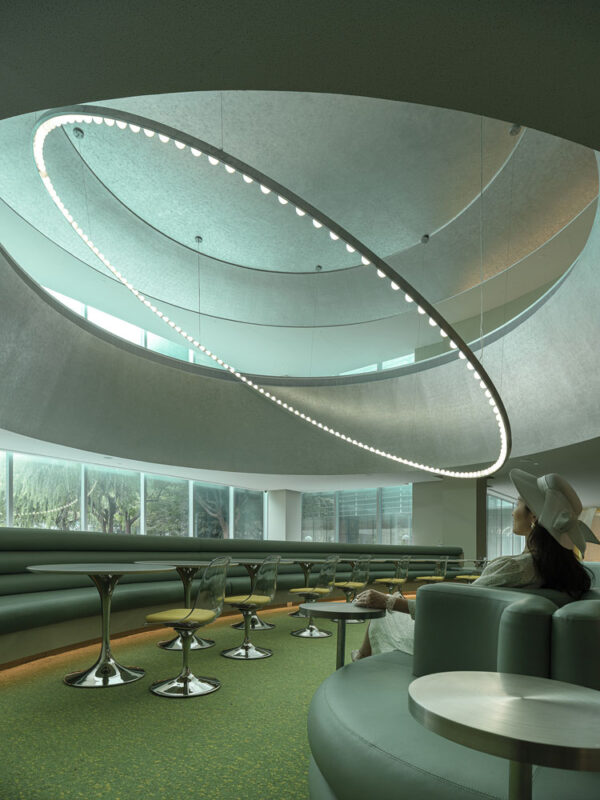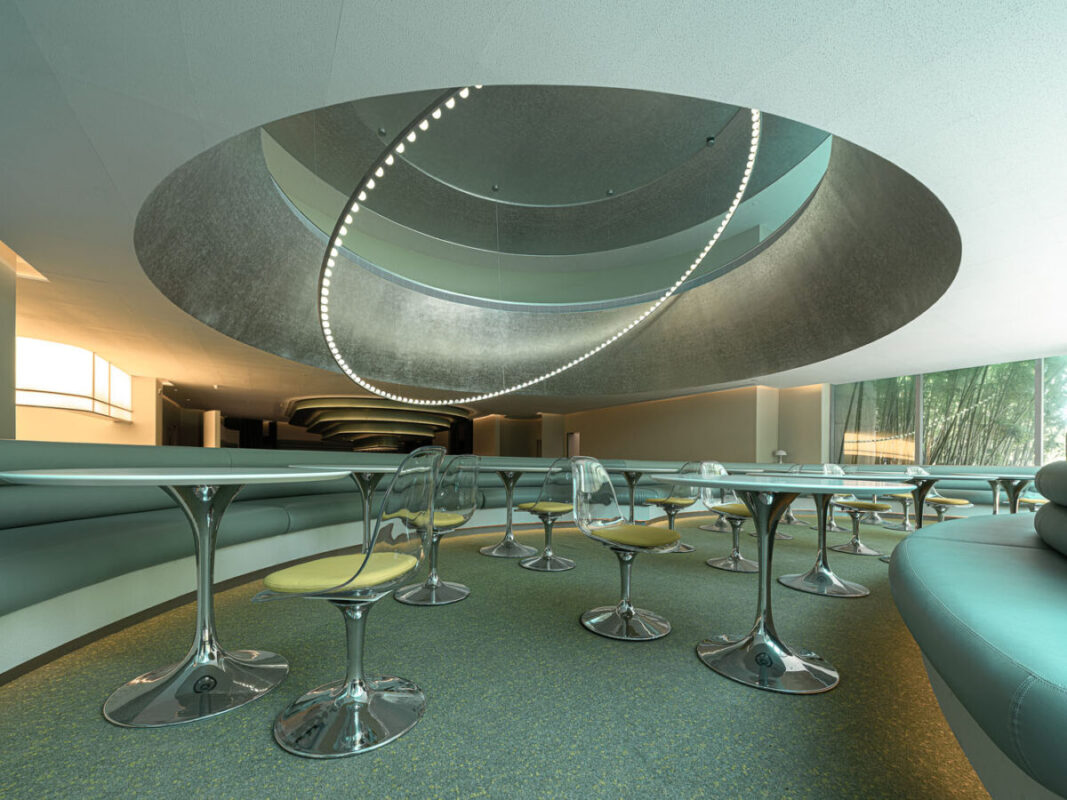Khi tiếp cận dự án, đơn vị thiết kế đã sử dụng các yếu tố thường gắn liền với trí tưởng tượng của con người hiện đại về tương lai như hình tròn, đường cong, trần mái vòm, để tạo ra những khung cảnh và bầu không khí “tương lai” trực quan hơn trong không gian.