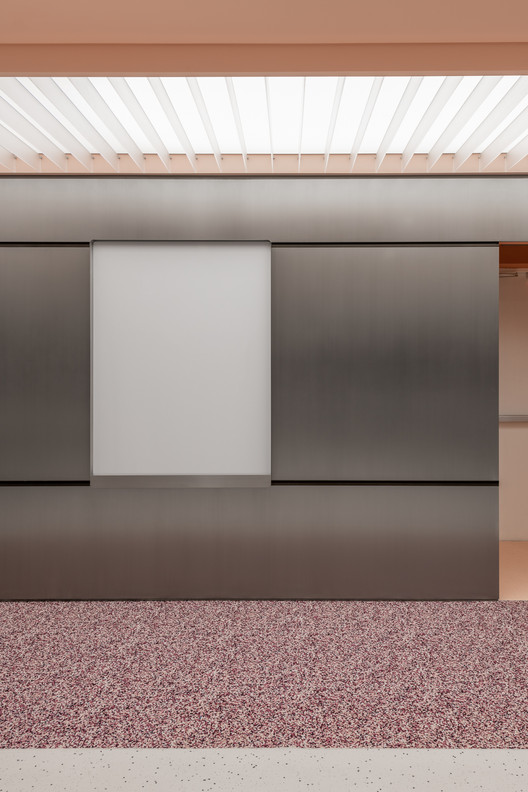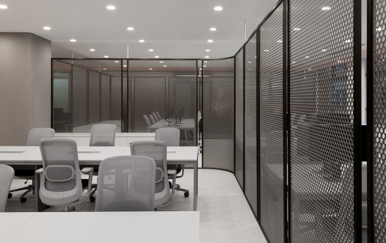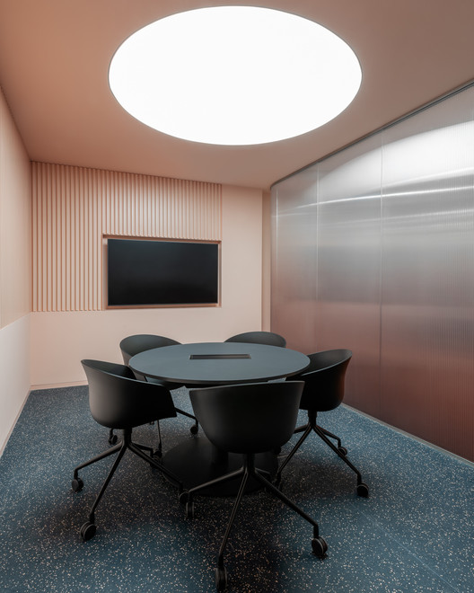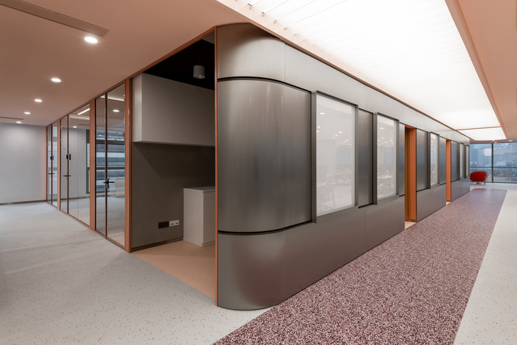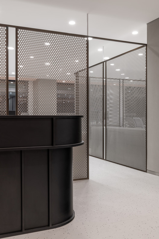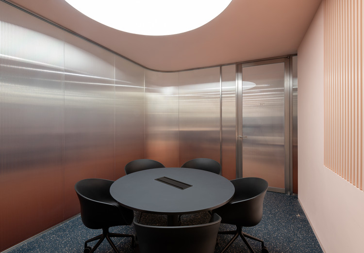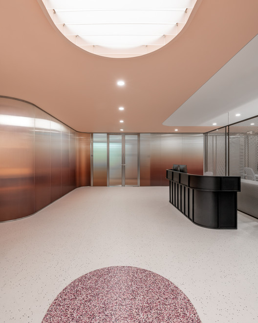Lối vào sử dụng một tấm kính cong và lớp chuyển màu hồng bao quanh ba phòng họp. Các nhóm trong văn phòng được phân chia bởi màng thép đục lỗ không gỉ , màu đen.