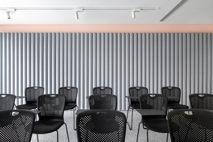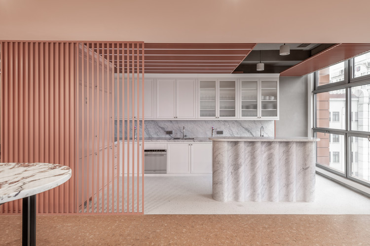 Sàn Cork nối liền tới khu vực tiếp khách có những bàn bằng đá cẩm thạch được làm từ ZaoZuo. Tất cả các thiết kế đã phối hợp tạo nét trẻ trung, thời trang và tinh tế cho văn phòng.