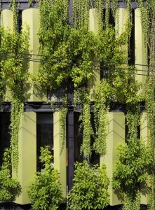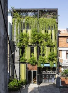 Trước tiên về mặt vị trí, mặt chính của văn phòng I.F.D Group được hướng về phía mặt trời. Điều này có nghĩa là mỗi sáng văn phòng sẽ được đánh thức bằng ánh mặt trời ấm áp và vàng rực. Một chút động lực cho ngày mới năng động và ngập tràn sức sống. Ngoài ra, để đảm bảo sự hài hòa và cân bằng, văn phòng được trồng thêm các loại dây leo. Dây leo xanh mướt rũ xuống, nhìn từ xa như một bức màn xanh mướt, bao phủ bề mặt văn phòng. Bức màn xanh này vừa có thể làm đẹp lại vừa có công dụng làm mát cho cả văn phòng.