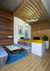 Bên trong văn phòng, khu vực quầy reception, phòng họp bố trí đồ nội thất gỗ cao cấp kết hợp với chậu cây, hoa lá.