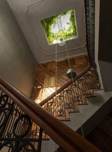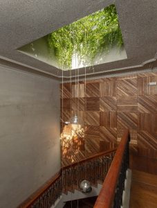 Vị trí cầu thang lên xuống có giếng trời phũ đầy cây xanh, là nơi cung cấp gió tự nhiên cho cả văn phòng.
